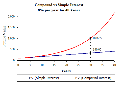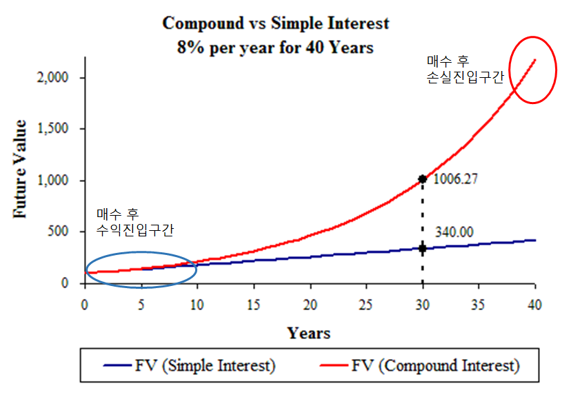 위의 그래프는 복리와 단리의 수익률 비교 자료인데 8%의 년간 수익률을 놓고 볼 때