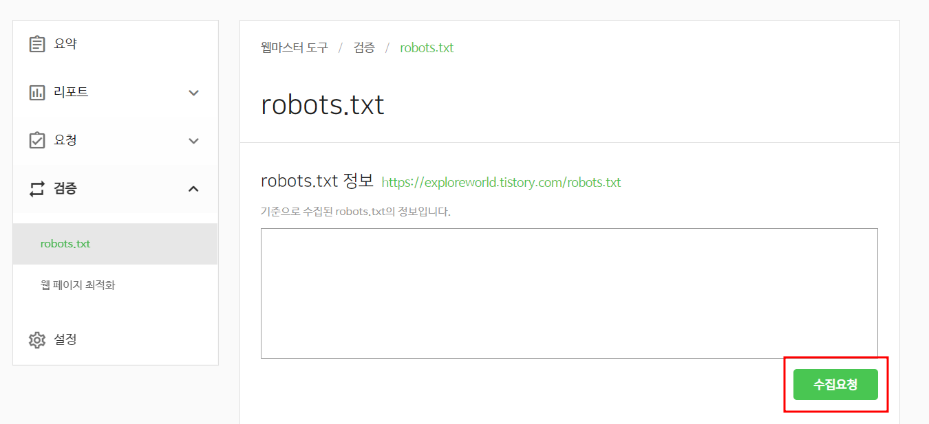 그리고 다시 네이버서치어드바이저에 돌아와서 검증 - robots.txt에 수집 요청을