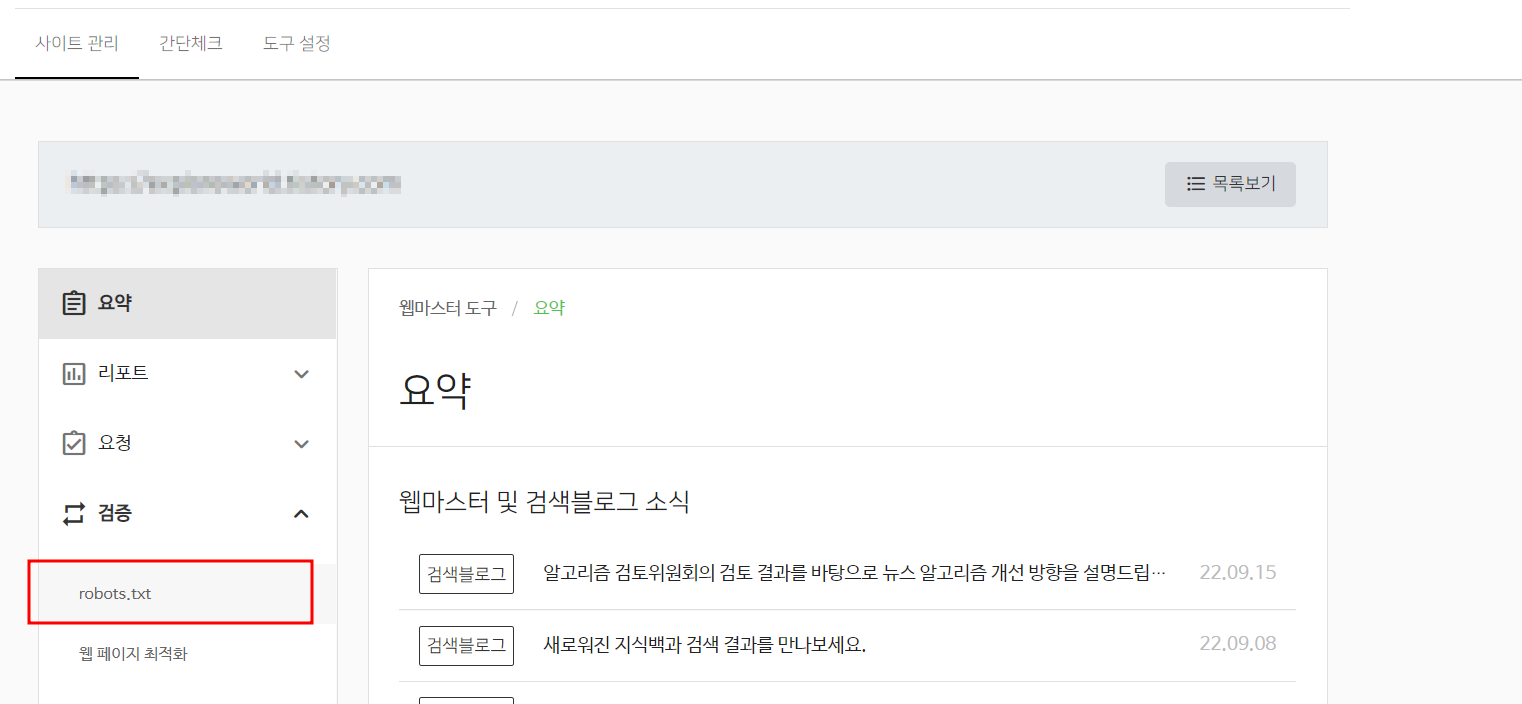 아래와 같이 사이트 관리로 이동 후 좌측에 검증 - robots.txt를 클릭합니다.