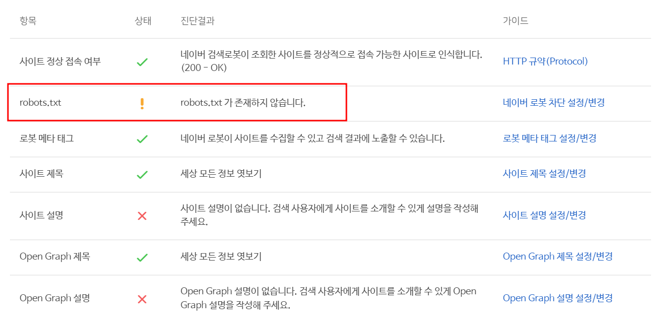 robot.txt가 존재하지 않습니다 라는 문구와 함께 상태에 느낌표 표시가