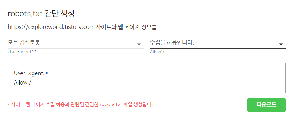 두가지 작업을 해줘야 되는데요. 첫번째로는 하단에 robots.txt. 간단 생성이라는 곳에서 수집을