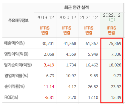 네이버의 재무 정보를 살펴보면 꾸준히 매출 및 이익이 증가되고 있고 2022년에도 7조 5천억 원의 매출을 달성할 것으로 예측되고 있습니다.