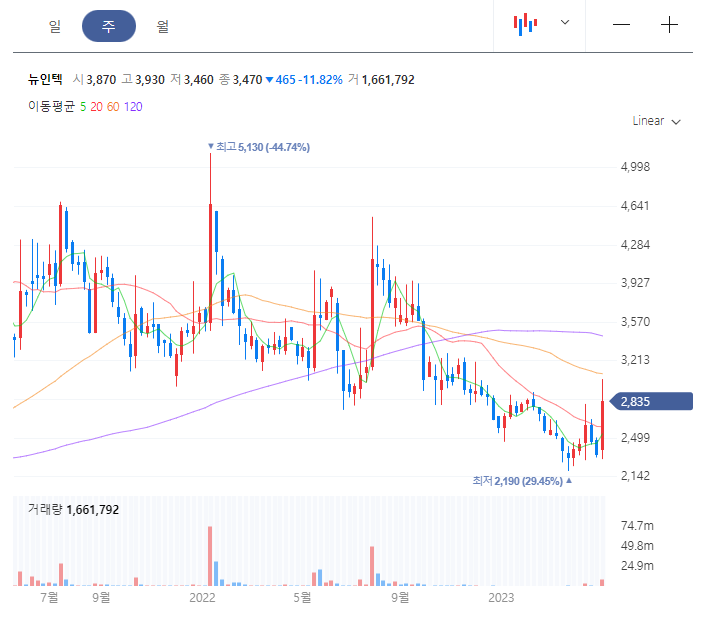 뉴인텍의 일봉차트를 보면 바닥에서 반등의 조짐이 보이고 있습니다. 거래량이 실리며 2번의 장대 양봉에서 많은 매수세가 실린 모습을 볼 수 있습니다. 주봉차트는 아직까지는 큰 하락세에서 벗어나지는 못고 있는데요. 주봉 차트상 최근 상승으로 인한 5일선과 20일선을 돌파하는 모습을 보여주고 있으며 일봉 차트의 흐름이 좋기때문에 지속적인 상승을 이어간다면 주봉차트도 60일선과 120선을 돌파하며 골든크로스로 완전한 상승 추세로 돌아설 수 있는 모습을 보이고 있습니다.