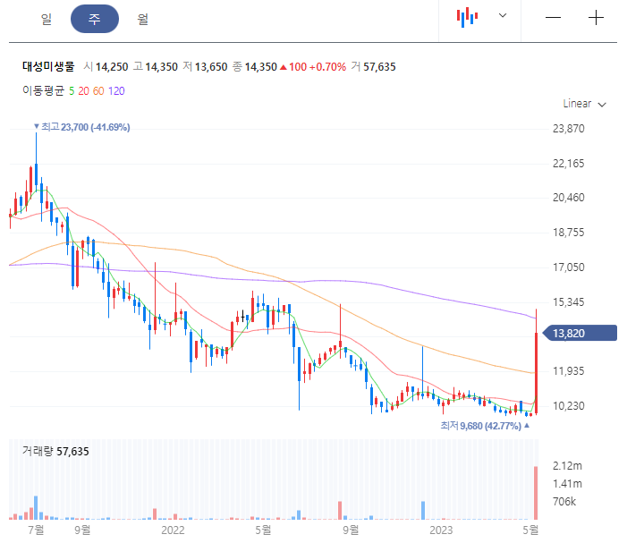 주봉차트는 전고점 기준으로 지속적인 하락세를 이어가고 있는데요. 반등이 나와주었지만 아주 강력한 재료는 아니기에 강한 상승반등은 조금 어려울 수 있으며 대성미생물은 동물의약품 사업에만 수십년을 집중한 기업이기에 내수 경기가 안정적인 특징이 있지만 실적이 크게 개선될 수 있는 성장동력이 부족하기 때문에 당분간 드라마틱한 상승을 기대하기 어려울 것으로 보여집니다.