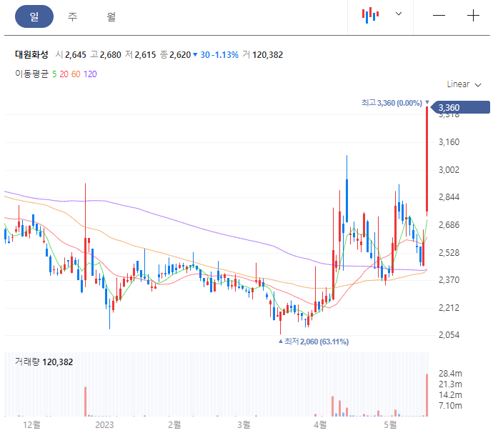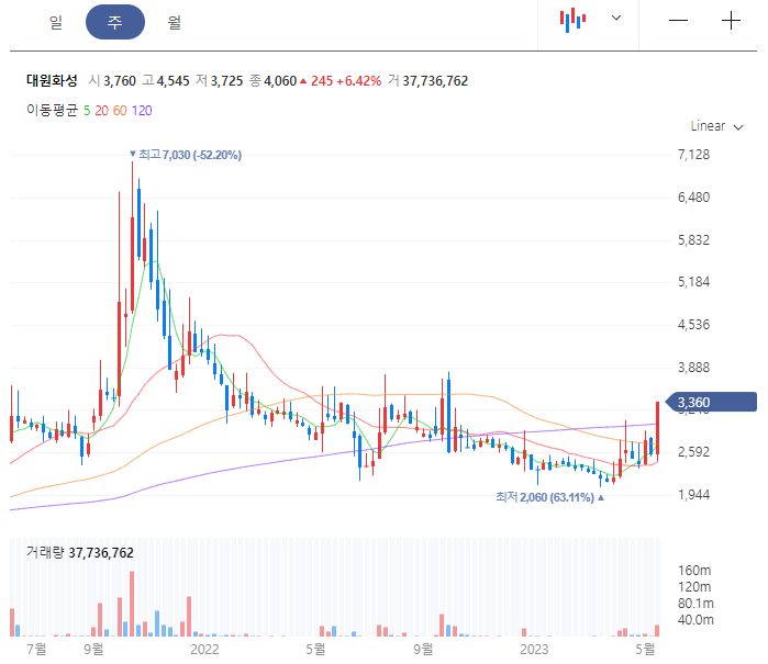 대원화성의 일봉 차트를 살펴보면 2,060원 저점 구간을 기준으로 반등을 시도하며 거래량과 상승세를 유지하고 있습니다. 다만 장기이평선의 정배열되기까지는 상승추세를 조금 더 지켜볼 필요가 있습니다. 주봉차트는 확실한 바닥 지지 구간 확인과 함께 반등 시작 구간에 있습니다. 하지만 20일선과 60일선이 아직 하방을 향해 있기 때문에 아직 지속적인 상승과 반등을 확신할 수 없는 상황입니다.