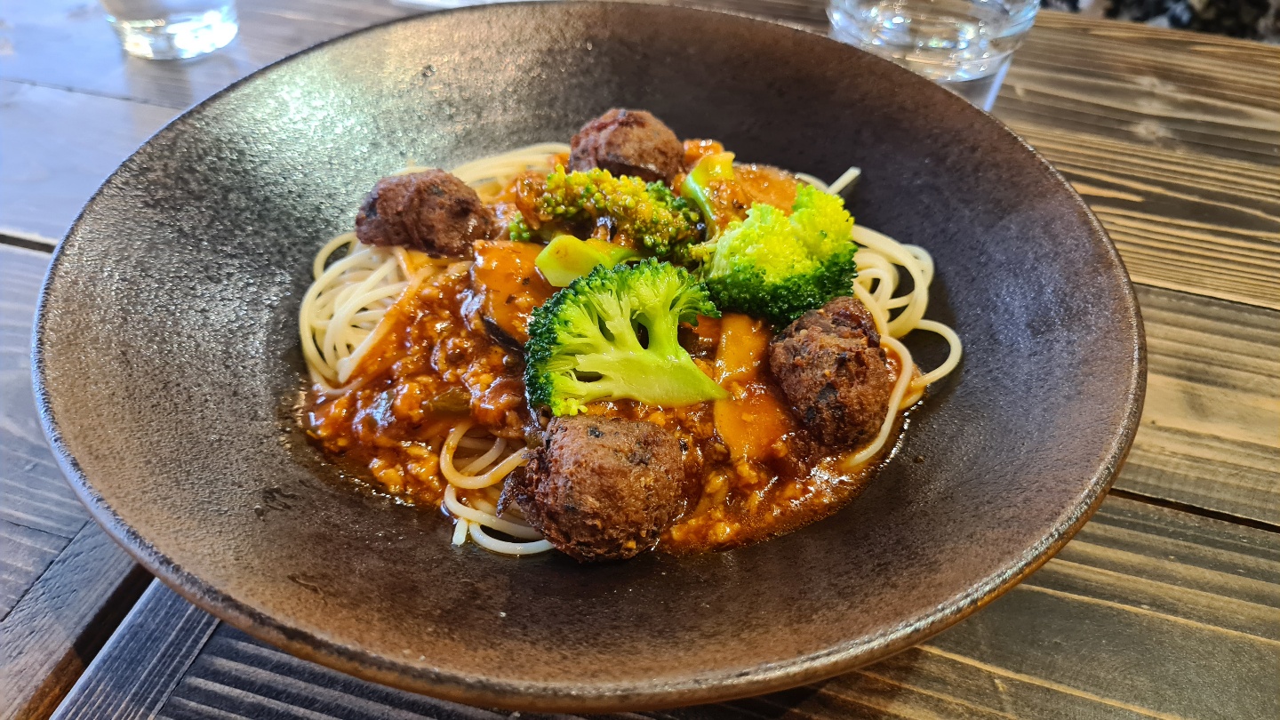 고기가 아닌 콩이나 곡물을 섞어 만든 거 같습니다. 스파게티 소스 또한 토마토 베이스 소스가 아닌 특별한 맛이었습니다.