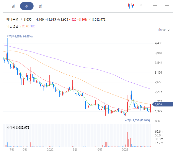 주봉차트는 전고점 대비 긴하락을 이어가고 있으며 바닥을 다지며 반등의 움직임을 보이고는 있지만 바이오주의 특성상 일시적인 상승일 수 있으며 가시적인 성과가 나올 때까지 보수적인 접근이 필요한 시점입니다.특히 메디프론의 바이오 신약 사업 부문은 현재 매출이 없다는 부분을 염두하여 매수해야 할 것으로 보여집니다.