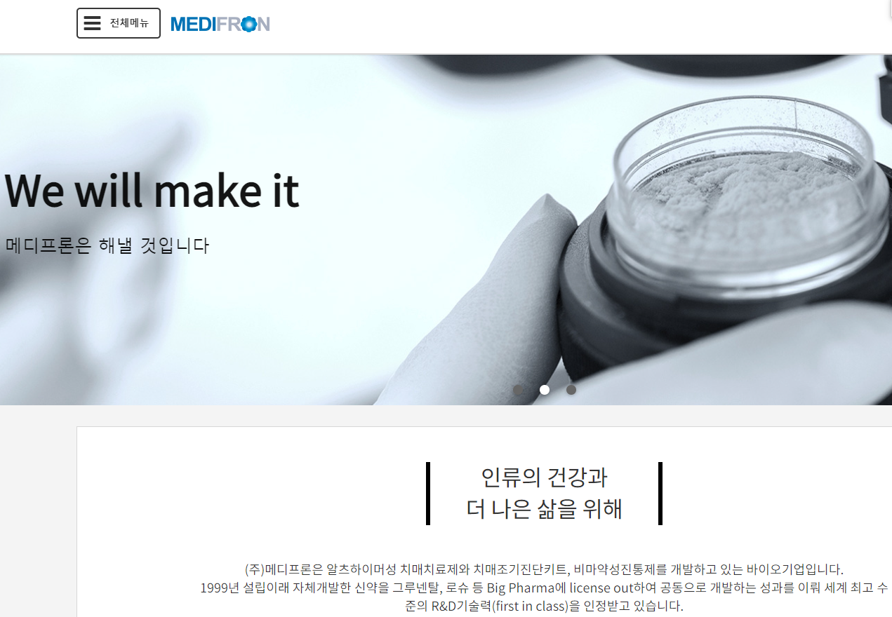 메디프론은 미국 제약회사 일라이릴리가 치매 치료제 임상 3상 결과가 성공적이라는 소식에 치매 관련주로 분류된 메디프론이 상한가를 기록하고 있습니다. 메디프론은 알츠하이머 신경 독성 차단 후보 물질에 대한 국내 특허를 취득하였고 비마약성 진통제 후보물질의 브라질 특허를 취득한 바 있습니다.