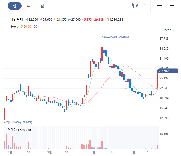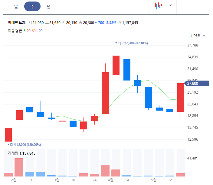 미래반도체의 일봉 차트를 보면 전고점 37,900원을 기점으로 지속적인 약세를 보이다가 최근에 반도체 섹터가 시장의 관심을 받으면서 반등을 하고 있는 모습입니다. 주봉 차트의 움직임도 일봉차트와 비슷한 흐름을 이어나가고 있으며 전기차 보급과 AI 반도체의 수요 증가로 인하여 반도체 관련주들은 지속적인 성장세를 이어나갈 것으로 예측됩니다.