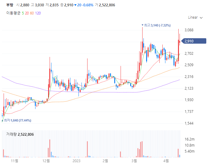 부방의 차트를 살펴보면 모든 이평선 위로 정배열하면 지속적인 상승 차트를 그리고 있습니다. 주봉으로는 2022년 10월 1640원 저점을 찍고 현재가 2910원 부근까지 상승한 모습을 보이고 있는데요. 주봉 차트 또한 모든 이평선을 뚫고 정배열한 모습을 볼 수 있고 단기 급락으로 인한 차트가 망가지는 모습이 연출되지만 않는다면 꾸준한 상승 추세를 기대해 볼 수 있습니다.