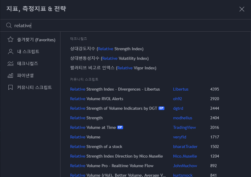 여기까지 완료하였으면 하나의 지표를 똑같은 방법으로 검색하여 추가하여 줍니다. 검색창에 Relative라고 검색하면 상대 강도지수 우리가 흔히 알고 있는 RSI지표가 하단에 나타납니다.
