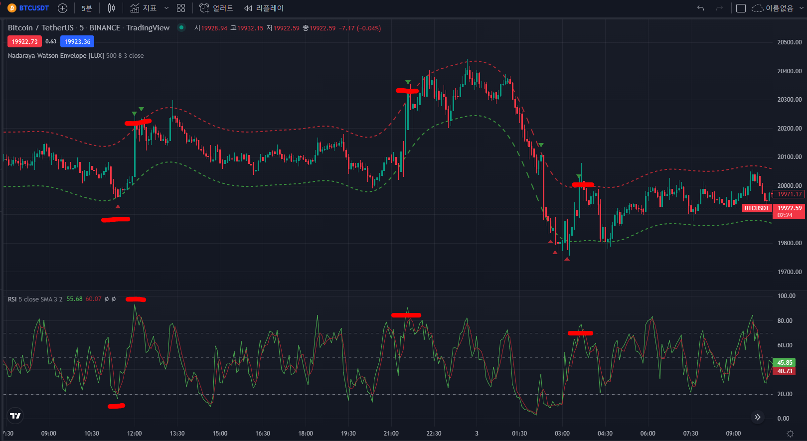 진입하면 됩니다. 아래 RSI지표를 통해 과매수, 과매도 수치를 참조하여 진입하면 더 승률을 높일 수 있습니다. 만약 초록색 매도 시그널이 나타났지만 RSI지수가 이미 많이 40 이하로 낮아졌다면 매수 반등이 나올 확률도 높아져 손실을 볼 수 있기 때문에 이런 경우 진입을 보류하는 것이 좋습니다.