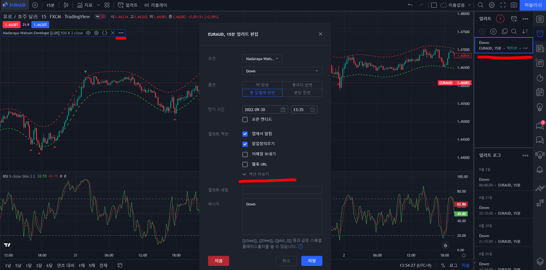 매수 매도 시그널 발생 시 해당 지표의 설정 누르는 곳에 점이 세 개 표시된 곳을 누르고 시계 모양과 플러스 마크가 있는 곳을 누르면 얼러트 추가가 되고 앱에서 알림, 팝업창 띄우기, 이메일 보내기 등 다양한 방법으로 알람을 받을 수 있습니다.