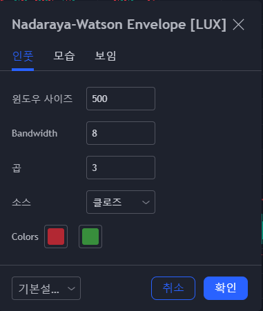 생성된 지표에 설정을 누르고 인풋 모습 보임 세 가지 탭 중에 인풋을 눌러 하단 컬러에 초록, 빨강 색상을 빨강, 초록으로