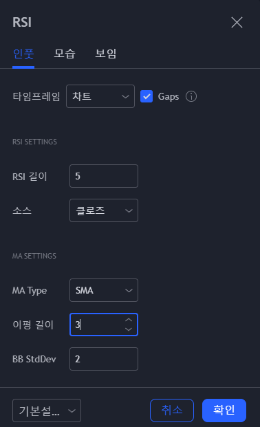 하단에 RSI에 설정을 누르면 인풋 모습 보임 설정 탭이 나타납니다. 여기서 인풋을 눌러 RSI길이를 5에서 14로 변경하고