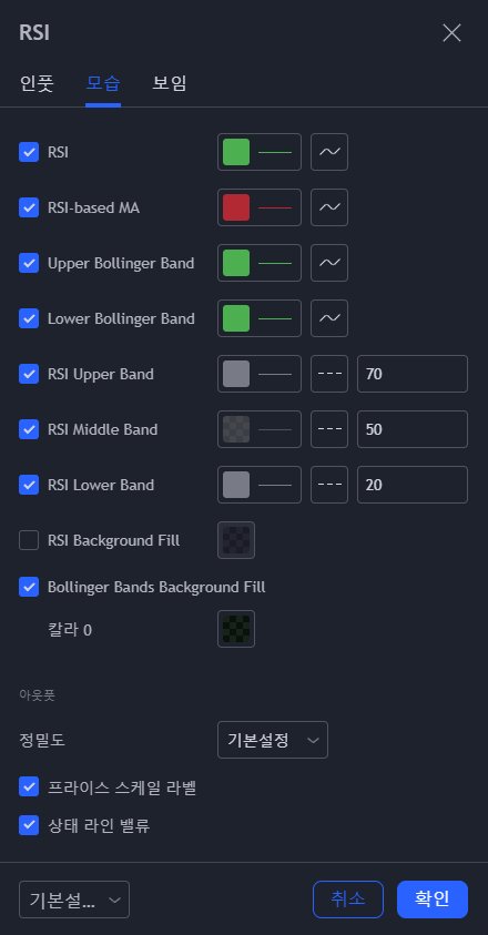 가운데 모습이라는 탭을 눌러 RSI 색상을 초록색으로 변경하고 RSI-Based MA를 빨간색으로 변경합니다. RSI Middle Band는 체크 해제하고 RSI Lower Band는 30에서 20으로 값을 변경해줍니다. Bollinger Bands Background fill은 해제 주시면 아래 이미지와 같이 세팅이 완료됩니다.