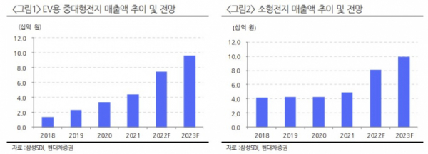 아래의 그래프의 매출 예상을 보시면 소형전지 매출액도 꾸준히 상승하지만 중대형 전지 부문의 향후 판매 비중이 지속적으로 확대될 것으로 예상하고 있습니다.