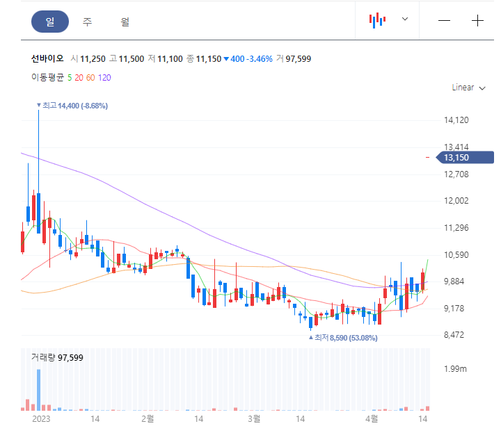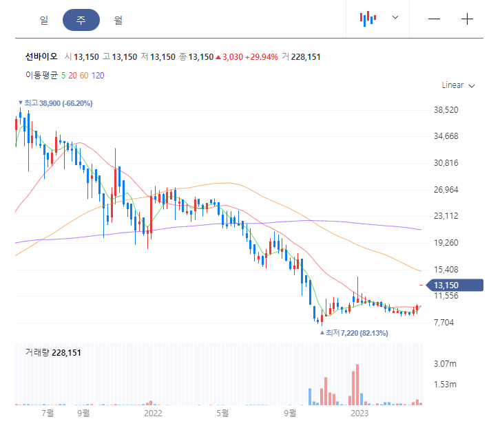 선바이오의 일봉 차트를 보면 금일 점상한가로 장시작하여 13,150원을 기록하였습니다. 오랜시간동안 충분한 조정을 거치며 모든 이평선이 모여있는 상황에서 쩜상을 기록한 것인데요. 차트 모양이 예측하기 어려운 상황이며 규모가 작은 기업인만큼 전고체 전해질 사업 진출은 강한 상승 재료로 작용할 것으로 보여집니다.