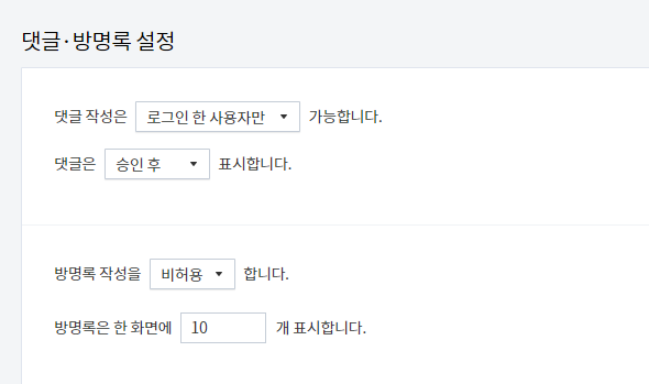 댓글 작성은 로그인 한 사용자만 가능합니다로 변경 댓글은 승인 후 표시합니다로 변경 방명록 작성을 비허용으로 변경 방명록은 한 화면에 10개로 표시합니다로 변경해 줍니다.
