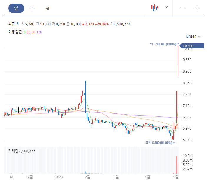 씨큐브의 일봉차트를 보면 지속적인 하락흐름을 보이다가 급등하는 모습을 보이고 있습니다. 충분한 지지선 확인과 완만한 반등을 수렴하지 않고 급등하였기 때문에 차트상 흐름은 예측하기 어려운 모습입니다.