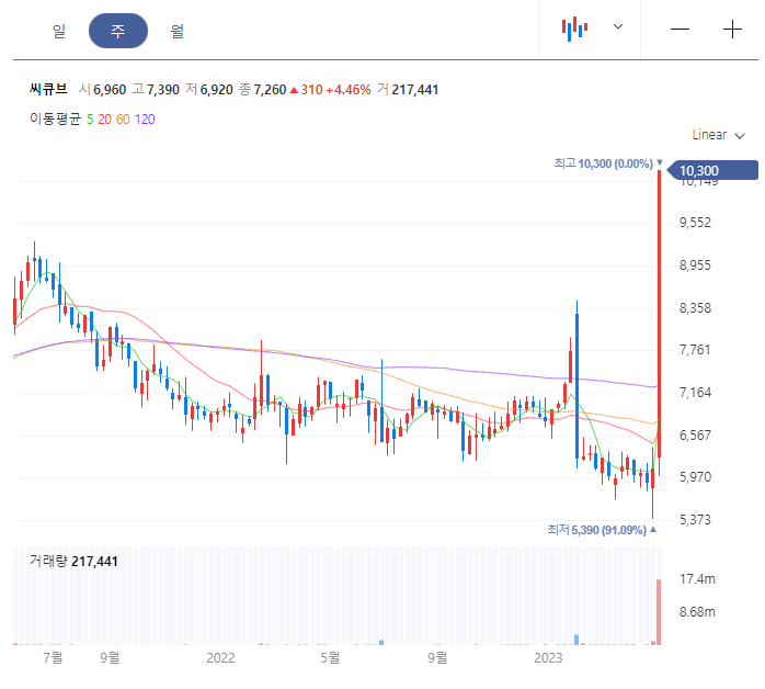좌측: 씨큐브 일봉 차트 / 우측: 씨큐브 주봉 차트