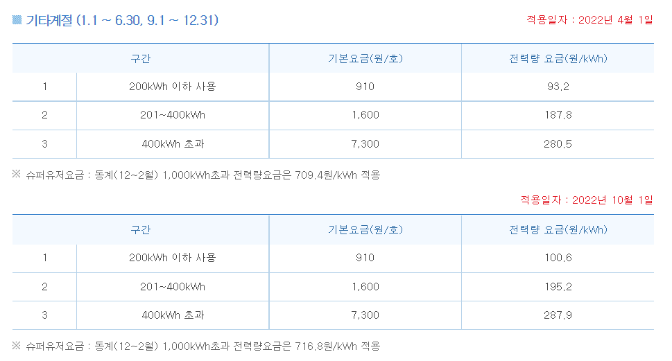 하계의 경우 2022년 10월 1일 기준으로 전력 단가가 100.6원으로 인상되었으며 1000 KWh 초과 사용의 경우 슈퍼 유저 요금이 적용되어 전력 단가가 709.4원/KWh이 적용되기 때문에 특별히 1000 KWh가 초과되지 않게 신경 쓰셔야 합니다.