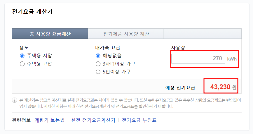 두 번째는 총 사용량 요금 계산 탭을 누른 뒤 계산된 전력 사용량을 입력하여 줍니다.(예시:270KWh 입력)
