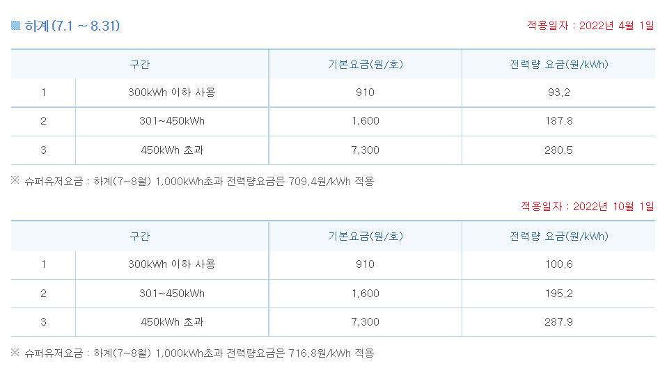 하계의 경우 2022년 10월 1일 기준으로 전력 단가가 100.6원으로 인상되었으며 1000 KWh 초과 사용의 경우 슈퍼 유저 요금이 적용되어 전력 단가가 709.4원/KWh이 적용되기 때문에 특별히 1000 KWh가 초과되지 않게 신경 쓰셔야 합니다.