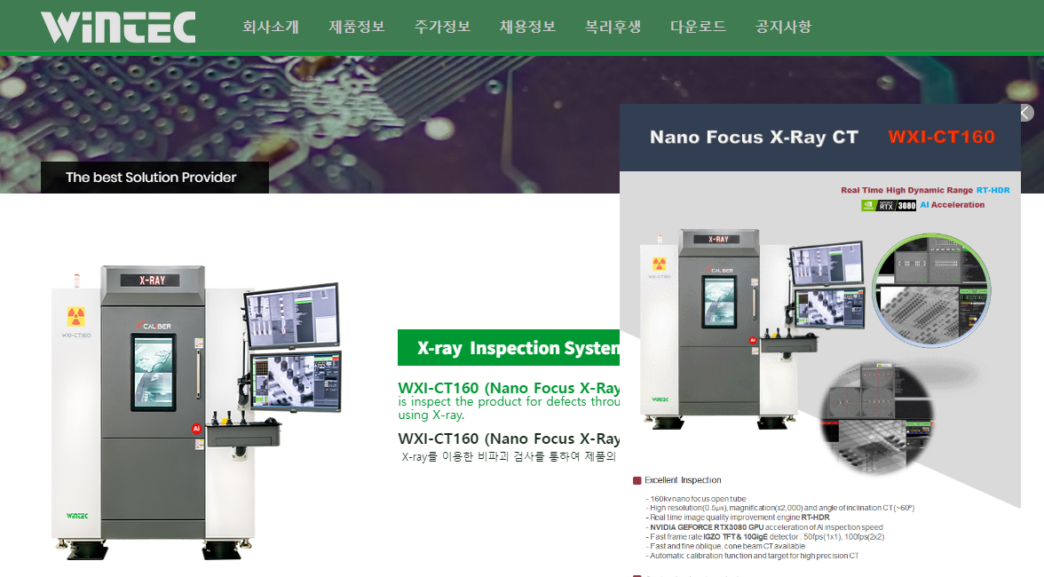윈텍은 머신비전 및 화상 처리를 통한 전자 부품, 디스플레이, 필름 검사 S/W 개발 및 장비를 제작하며 컨덴서, 인덕터, 저항 등의 마이크로 칩의 정상적인 패널 위치와 부품 부착 상태를 검사하는 디스플레이 검사기, 이차 전지에 사용되는 동박필름의 외관을 검사하는 필름 검사기를 주력으로 하고 있습니다.