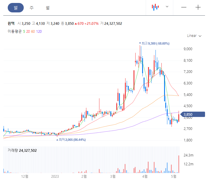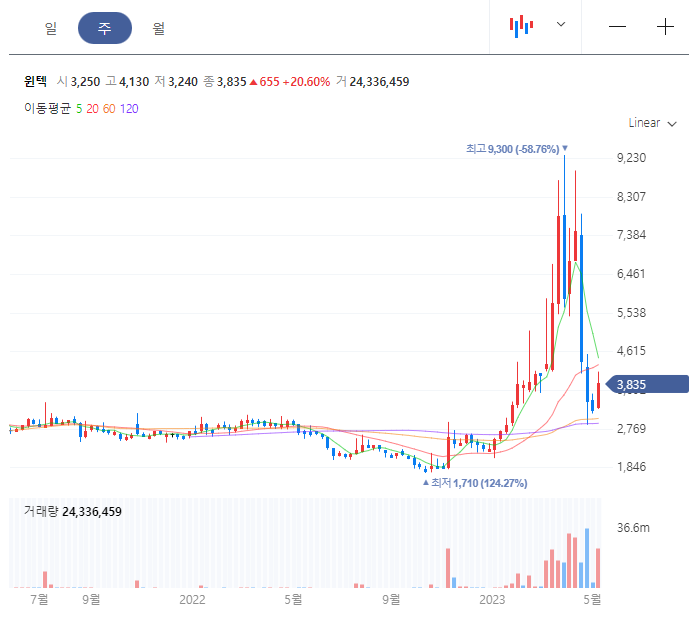 윈텍의 일봉차트를 보면 전고점 9300원을 기점으로 오너십 리스크가 터지면서 2875원까지 하락하며 1/3로 주가가 급락한 모습을 볼 수 있습니다. 현재 동박 필름과 관련한 호재로 인해 조금은 회복되는 모습을 보이고 있습니다. 주봉차트 또한 급등 이후에 급락세를 보이고 있는 모습인데요.