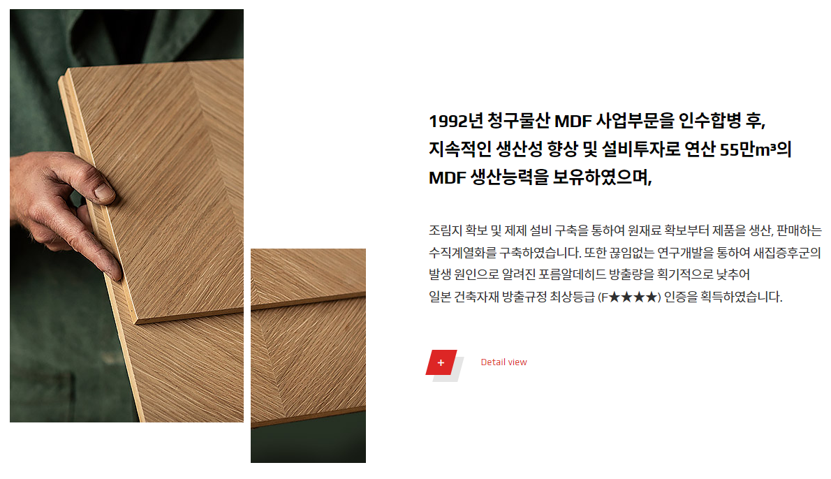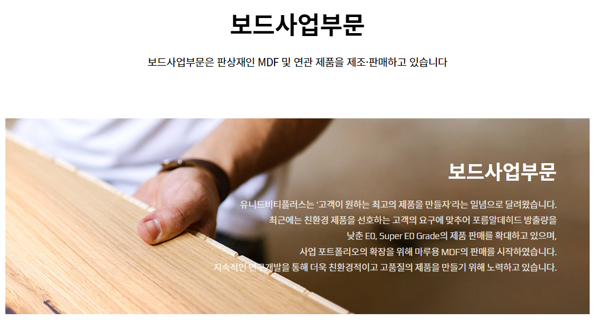 가구, 인테리어 등에 주로 사용되는 목질판상재인 MDF와 마루, LPM 등 MDF소재를 2차 가공하여 생산 판매하고 있으며 PB,합판, 제재목, 원목 등의 목재제품도 취급하고 있습니다. 주요 특징으로는 국내산 목재를 주원료로 사용하며 직경이 작고 굴곡이 많아 활용도가 낮은 목재를 사용하여 국내 목재 자급률 제고에 중요한 역할을 합니다.