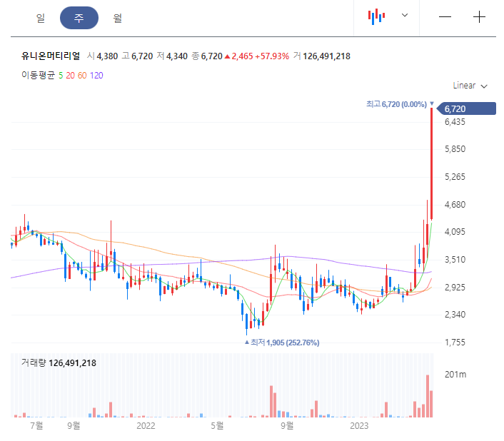 유니온머티리얼의 일봉차트를 보면 120일선까지 모두 정배열 상태에서 더욱 강한 상승세를 유지하고 있습니다. 주봉차트 또한 비슷한 차트 모습을 보여주고 있습니다. 워낙 전기차와 희토류라는 강한 상승재료를 통해 상승 분출하고 있고 단발적인 호재가 아니기 때문에 앞으로도 추가 상승의 여지는 있을 것으로 보여집니다. 하지만 거래량과 변동성이 크게 증가하면서 등락폭이 클 것으로 보여지기 때문에 보수적인 접근이 필요한 시점입니다.