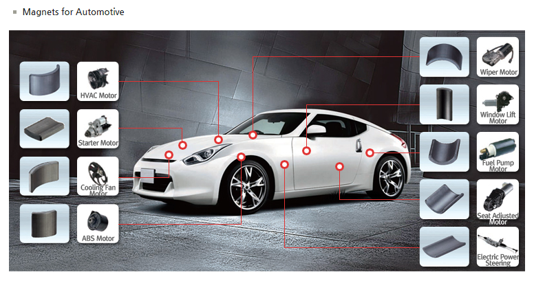 모터용 자석: 자동차의 각종 모터에 적용되는 마그네트 자성 부품으로 최근에는 전기차의 구동 모터에 적용되며 시장 규모가 커지고 있으며 그 이외에도 차량의 많은 구동 장치 부품에 마그네트가 적용되는 모터에 이용됩니다.