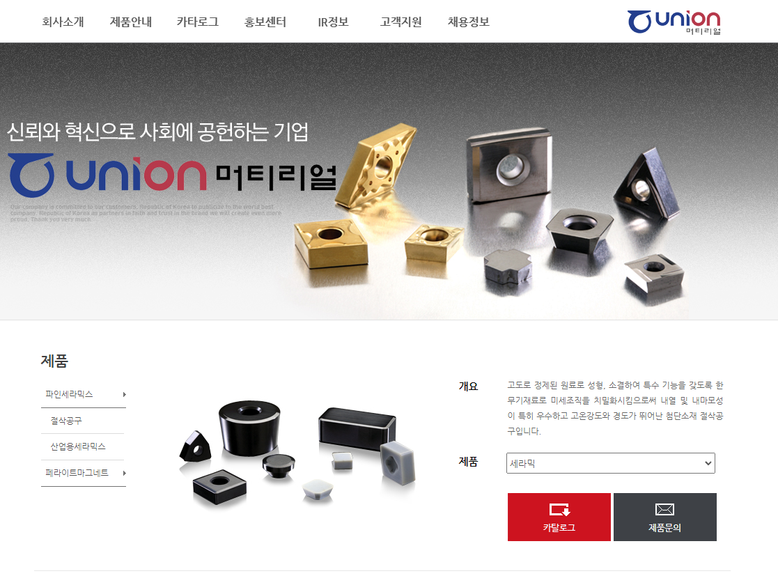 유니온 머티리얼은 크게 페라이트 마그네트 소재 부품을 이용한 모터와 세라믹을 이용한 절삭 공구로 분류할 수 있습니다. 모터 부문은 자동차 완성차 업체 현대차 그룹 그리고 절삭 공구 부문은 보쉬와 국내 중대형 건설사 등의 주요 고객사를 보유하고 있습니다.