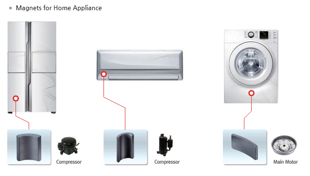 가전 및 컴프레서 자석: 냉장고와 에어컨 세탁기 등에 들어가는 모터와 컴프레서 내부에 마그네트가 사용되며 이외에도 소형 전동 공구 및 IT기기 그리고 모빌리티 등에 소형 모터에도 사용됩니다.