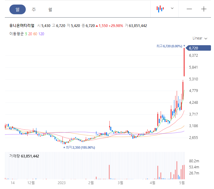 유니온머티리얼 주가 '싱글벙글'…테슬라 희토료 대체로 상승세 (2023년5월3일)