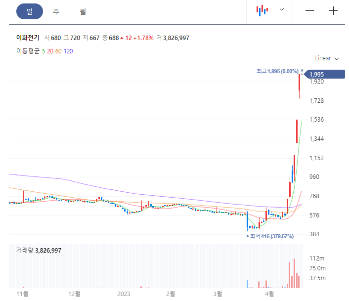 이화전기의 최근 급등세를 보면 무서울 정도로 상승하였는데요. 일봉과 주봉 차트 구간 모두 대량 거래를 동반한 엄청난 상승세를 보여주고 있습니다. 2차 전지 소재주 관련으로 분류되면서 관련 종목들이 급등하고 있는 상황이지만 아직 제대로된 실체나 가시적인 성과를 보여주고 있는 업체는 많지 않기 때문에 신중한 접근이 필요한 시점입니다.