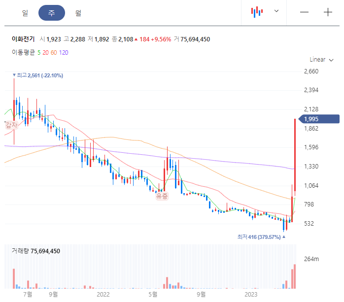 이화전기의 최근 급등세를 보면 무서울 정도로 상승하였는데요. 일봉과 주봉 차트 구간 모두 대량 거래를 동반한 엄청난 상승세를 보여주고 있습니다. 2차 전지 소재주 관련으로 분류되면서 관련 종목들이 급등하고 있는 상황이지만 아직 제대로된 실체나 가시적인 성과를 보여주고 있는 업체는 많지 않기 때문에 신중한 접근이 필요한 시점입니다.