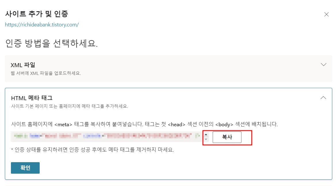 내 Meta태그를 복사하여 티스토리 블로그에 꾸미기 - 스킨 편집 - MTML편집으로 이동합니다.