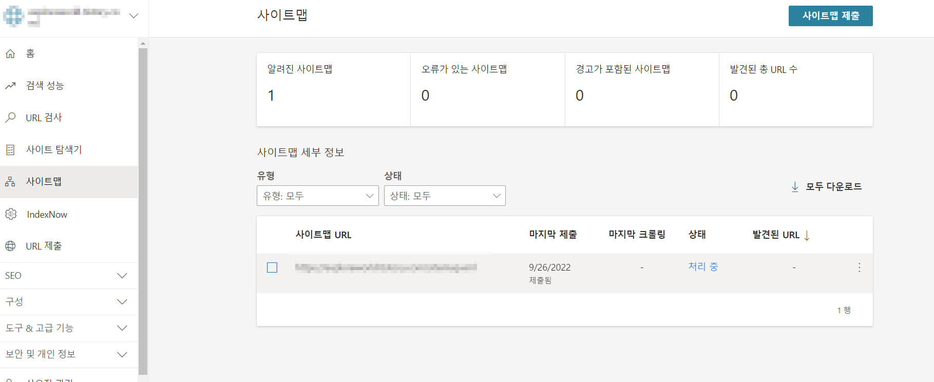 그리고 마지막으로 Sitemap을 추가하여 줍니다. 좌측 사이트맵 클릭후 사이트맵 제출 클릭