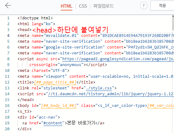 복사한 Meta태그를 <head> 와 </head>사이에 넣어줍니다.