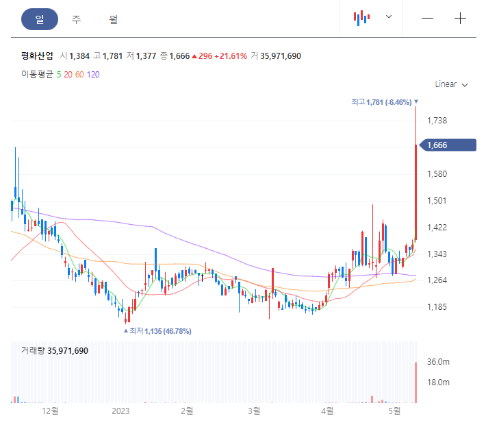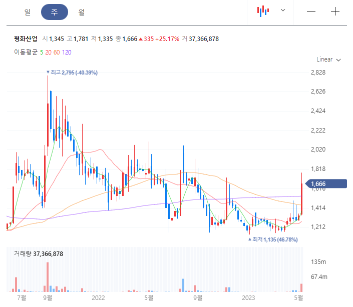 평화산업의 일봉 차트를 보면 저점 기준 1135원에서 충분한 저점 구간 수렴 후 거래량이 증가하며 상승세를 이어나가고 있습니다. 모든 이평선이 정배열되며 금일 큰 상승이 나와주었는데요. 평소 거래량과 변동성이 크지 않아 최근의 상승세가 제대로된 반등의 움직임인지는 조금 더 지켜봐야 합니다.