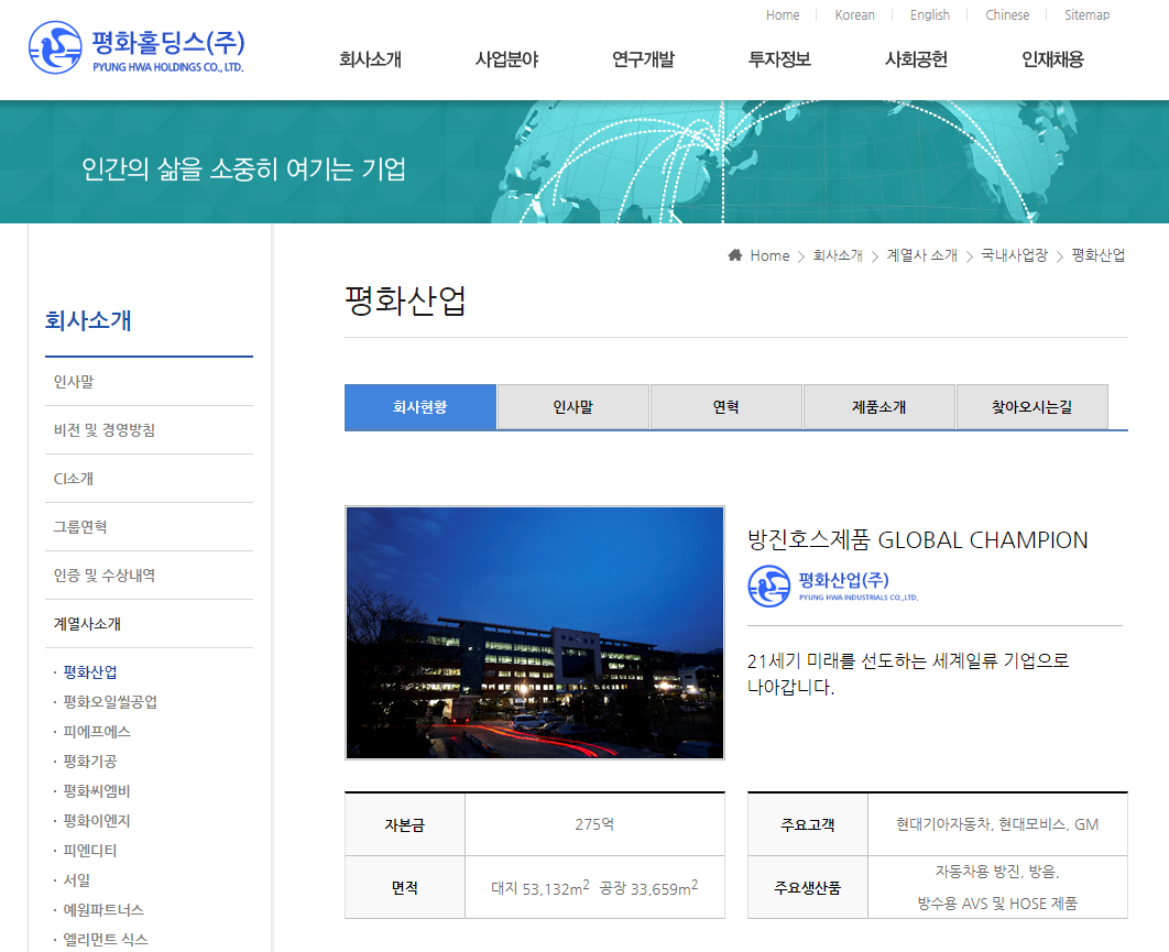 평화산업(090080)은 1950년 설립된 평화고무공업사를 모태로 하고 있으며 2006년 5월 평화홀딩스로부터 인적분할하여 설립되었습니다. 사업 분야는 방진, 에어서스펜션, 호스 자동차 부품 등을 생산하여 국내 완성차 업체에 판매하고 있으며 미국, 중국, 인도 등에 자회사 및 계열사를 통해 해외 시장에 제품 공급중입니다.