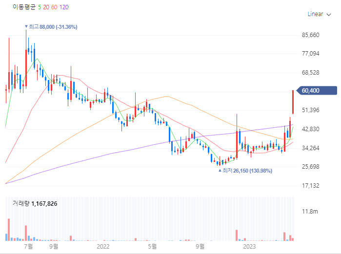 포스코스틸리온의 일봉 차트를 보면 4월 41,000원에서 모든 이평선 정배열에서 강한 상승세가 연출되고 있습니다. 일봉상으로는 금일 상한가로 인해 약간의 오버슈팅의 그림을 연출하는 듯 보이지만 주봉상 흐름은 강한 상승의 시작 지점정도로볼 수 있습니다. 작년 고점 88,000원 지점 부근까지는 큰 저항선이 없는 차트의 모습을 보여주고 있습니다.