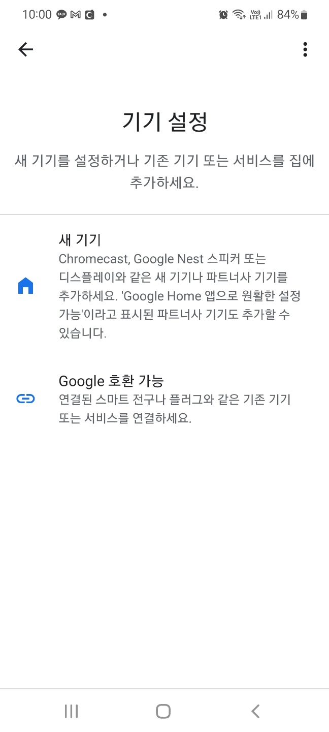 구글홈 어플을 여시면 첫 번째 이미지가 보입니다. 좌측 상단에 +마크를 클릭 > 두 번째 이미지 기기설정 클릭 > 세 번째 이미지 새 기기 클릭
