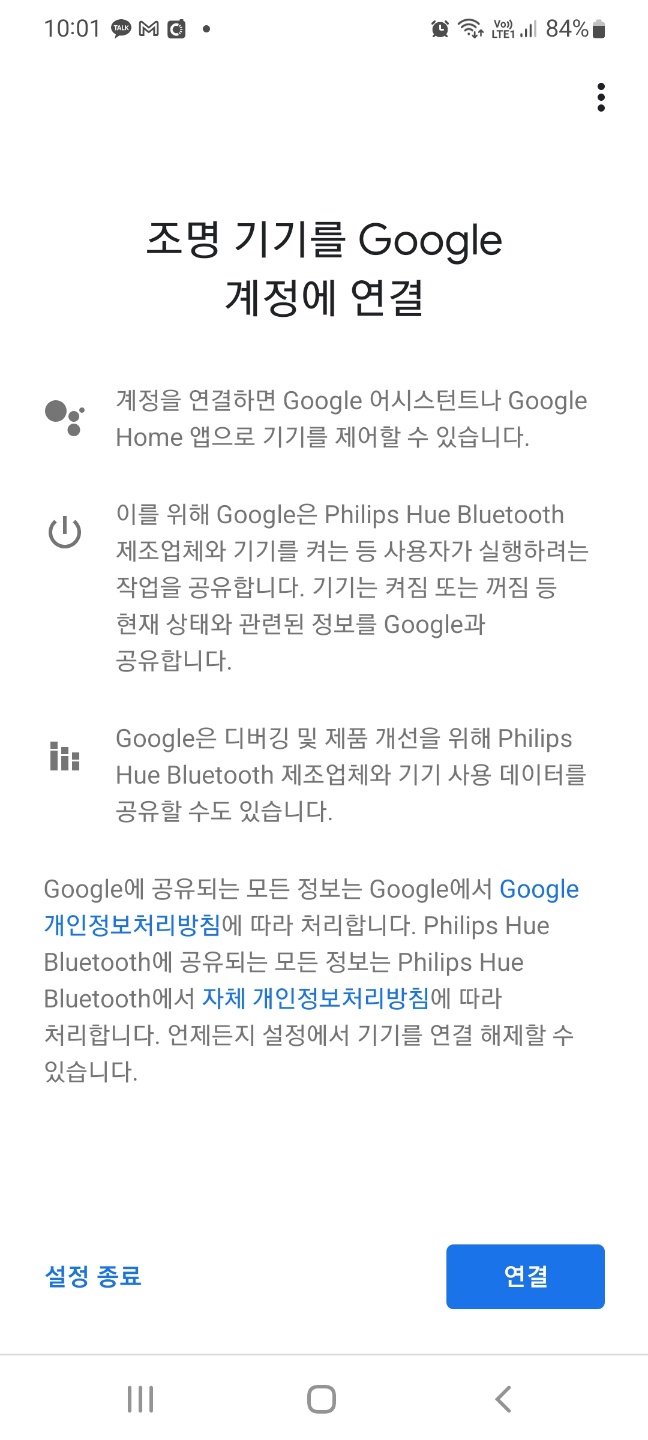 아래와 같이 조명 기기를 Google 계정에 연결이라는 첫 번째 이미지와 같은 화면이 나오면 연결 눌러주시고