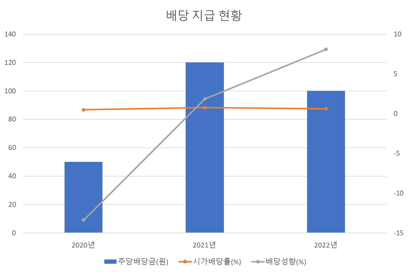 한일화학은 결산 배당을 실시하고 있으며 2021년에는 주당 120원을 지급하였고 2022년 연결 기준 주당 100원 배당 지급을 확정하였습니다. 시가 배당률은 높지는 않지만 순이익에서 배당 지분을 계산한 배당 성향은 매년 높아지고 있으며 주주환원의 일환으로 1993년 이후 연속으로 결산 배당을 시행하고 있습니다.