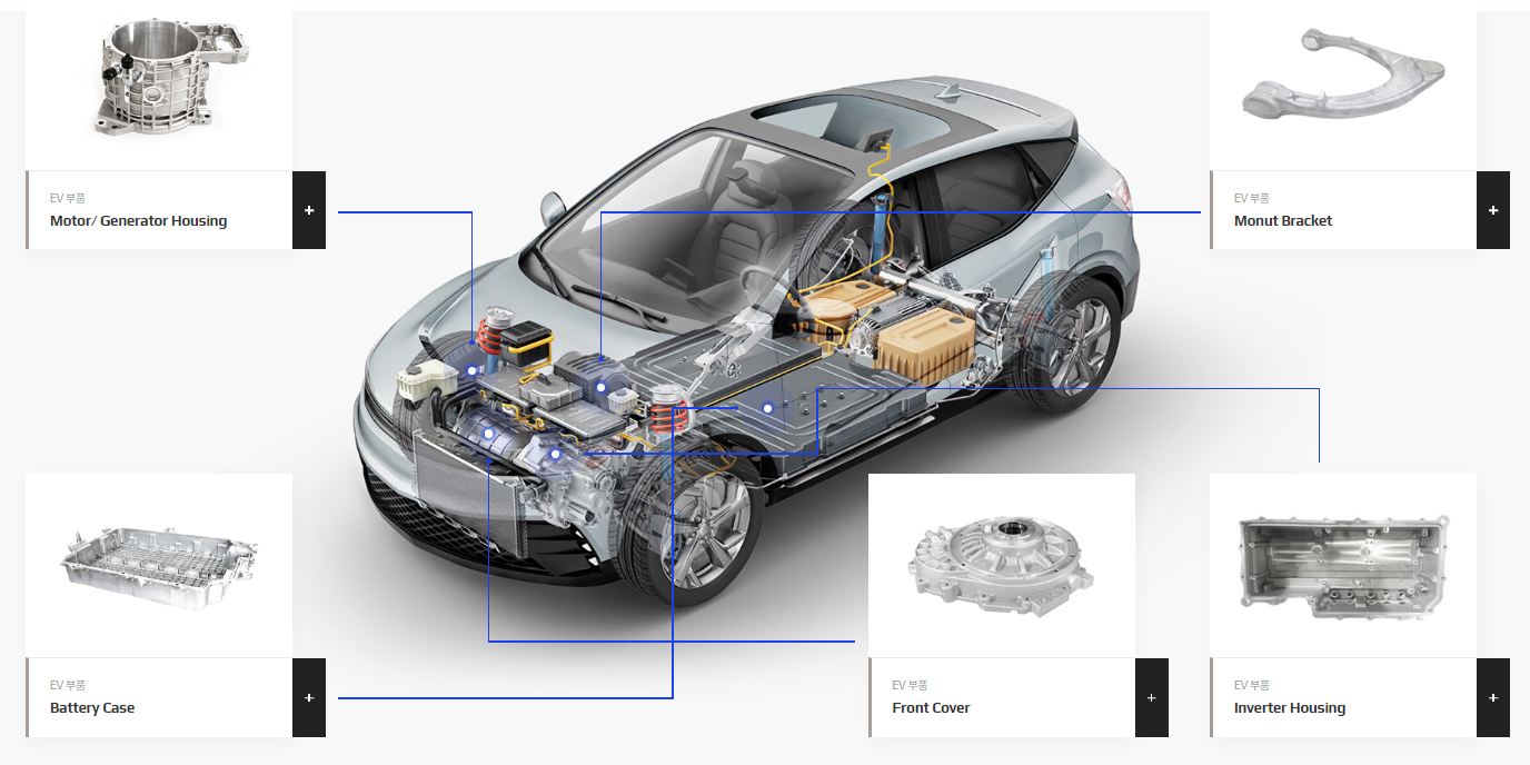 친황경 모빌리티에 대한 다양한 부품 개발 공급으로 알류미늄 합금 소재를 기반으로 모터 하우징, 배터리 케이스, 인버터 하우징 등의 강한 내구성과 경량화된 부품을 공급하고 있습니다.