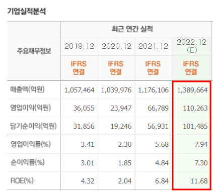 매출 규모는 2019년 이래 완만한 성장세를 이어나가고 있으며 2022년 기준 예상 매출액은 138조를 기록할 것으로 보입니다. 기관의 투자 의견은 매수 추천에 목표주가는 259,474원입니다.