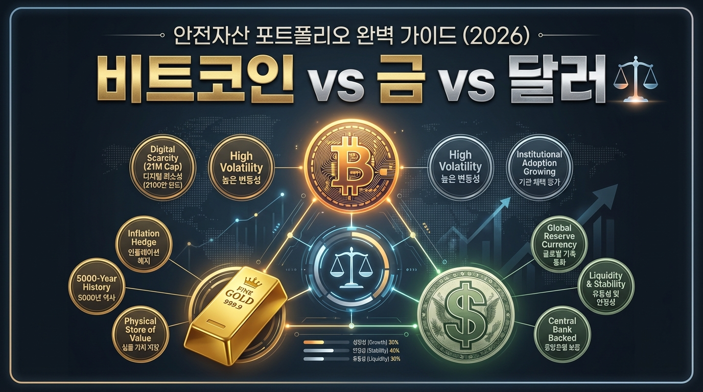 안전자산(Safe Haven Asset)은 경제 위기나 지정학적 불안 시 가치를 유지하거나 상승하는 자산을 말합니다. 2026년 현재 비트코인·금·달러가 3대 안전자산으로 주목받고 있지만, 각각의 역할과 특성은 완전히 다릅니다.